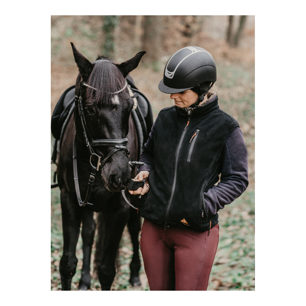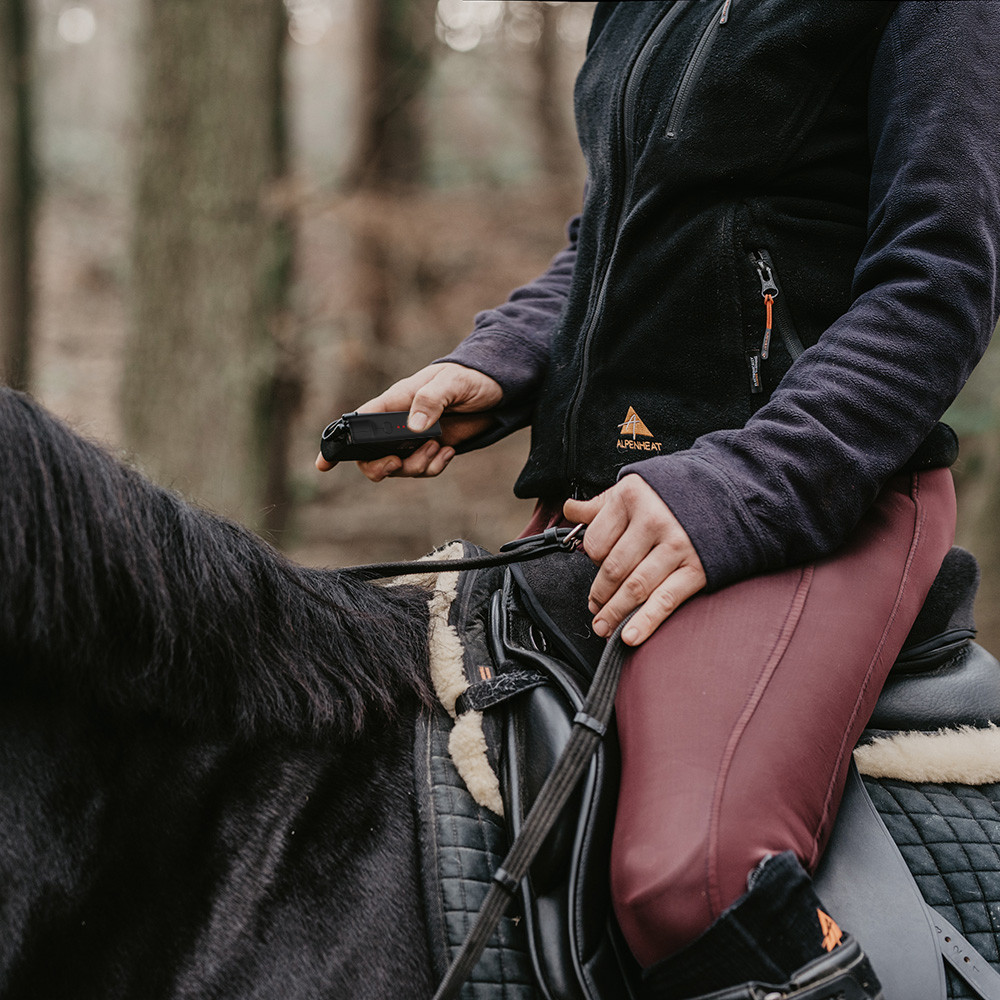 Inovativni grijani prsluk marke ALPENHEAT nezamjenjiv je, posebno u hladnijim danima. FIRE-FLEECE grijani prsluk impresionira sofisticiranim funkcionalnim detaljima. Nudi četiri razine grijanja sa posebnim sustavom grijaćih ćelija izrađenim od termalnih vlakana koja su ugrađena u stražnji dio odjeće i pružaju toplinu od 2 do 8,5 sati, ovisno o razini. Željena razina topline može se odabrati izravno putem aplikacije na mobilnom uređaju ili pritiskom na gumb na bateriji. Baterija se pohranjuje u vanjskom džepu prsluka.