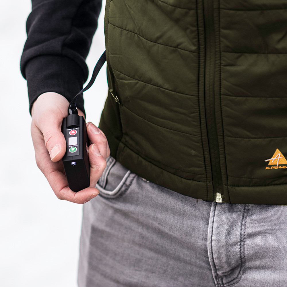 Il gilet riscaldante colpisce per i suoi ingegnosi dettagli funzionali. Dispone di 4 livelli di riscaldamento con uno speciale sistema di celle di riscaldamento in fibre termiche incorporate nella parte posteriore dell'indumento. Con 4 diversi livelli di riscaldamento, garantisce da 2 a 8,5 ore di calore accogliente prima che la batteria debba essere ricaricata. L'impostazione del calore può essere regolata tramite l'APP Alpenheat sul dispositivo mobile o premendo il pulsante sul pacco batteria.